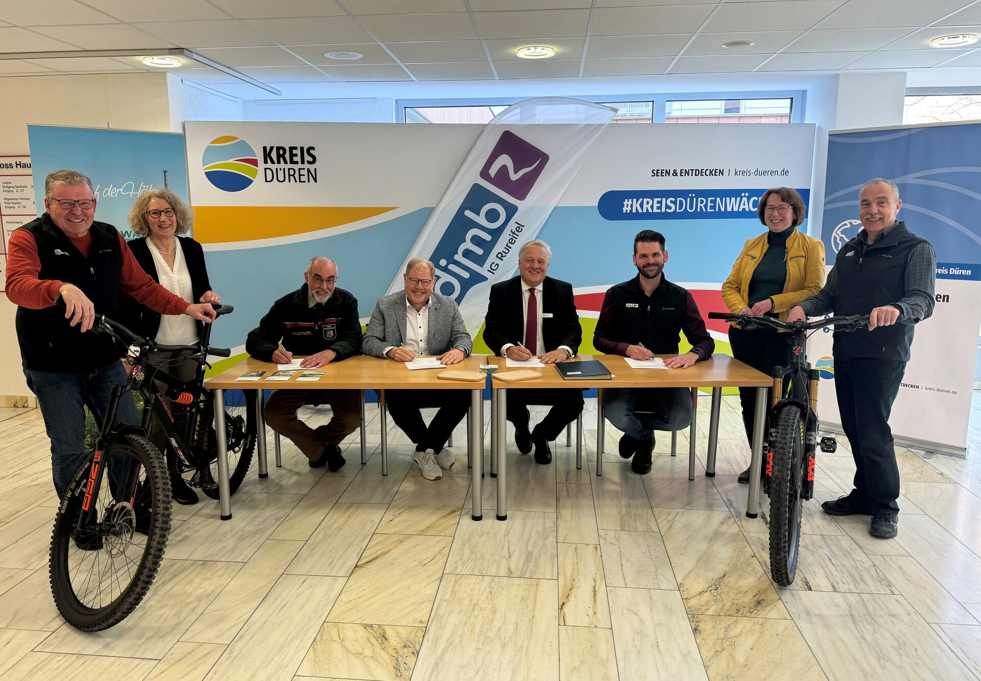 Gemeinsam mit dem Kreis Düren, dem Regionalforstamt Rureifel-Jülicher Börde und der Gemeinde Hürtgenwald wird der Verein dafür sorgen, dass Mountainbikerinnen und Mountainbiker ein attraktives Streckenangebot für ihren Sport nutzen können. Im Kreishaus unterzeichneten die Beteiligten den gemeinsamen Vertrag, mit dem einige Neuerungen auf dem Parcours in Raffelsbrand einhergehen.