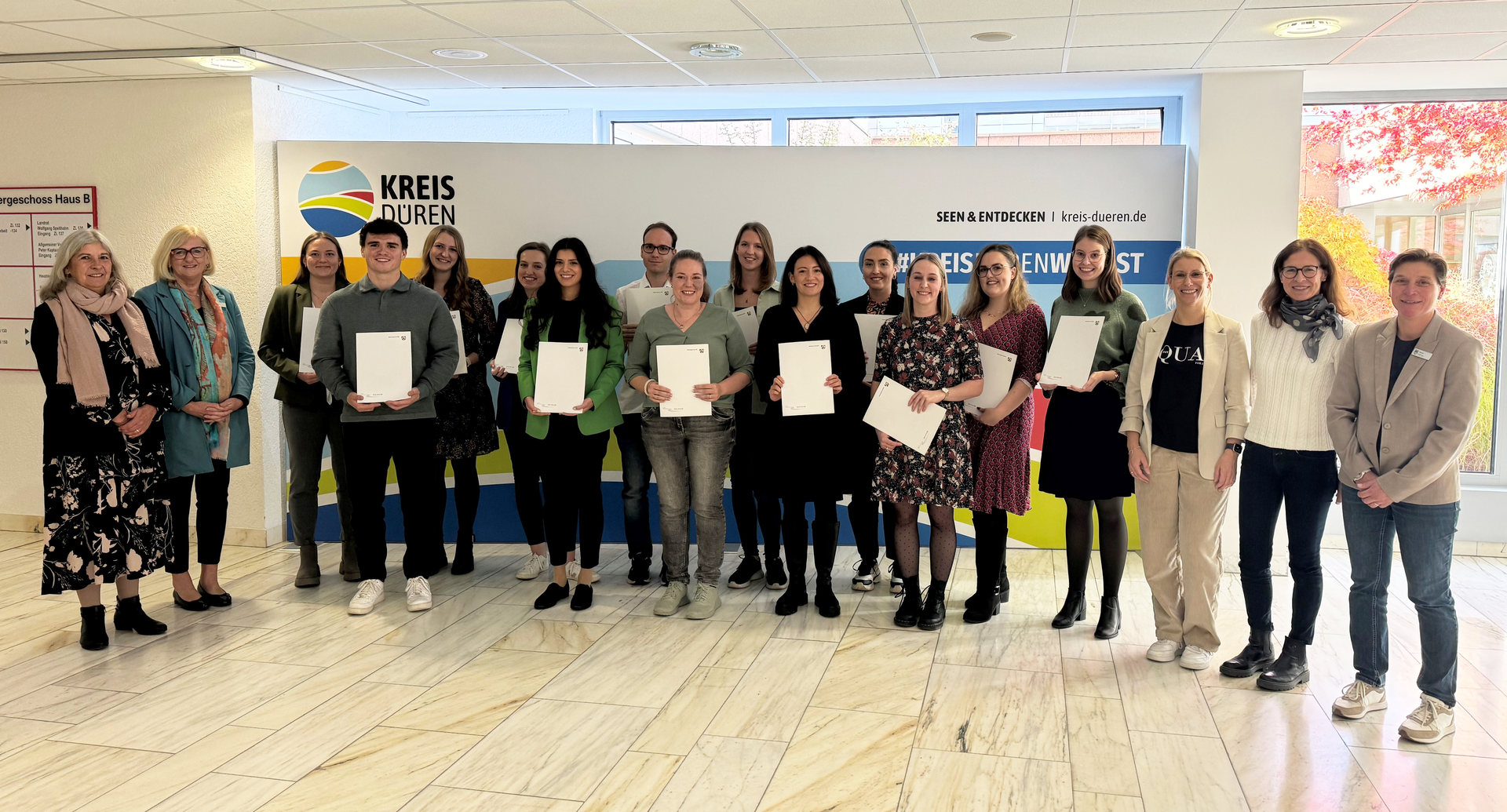 Die neuen Grundschullehrerinnen und -lehrer sowie die Verantwortlichen aus der Verwaltung im Kreis Düren.