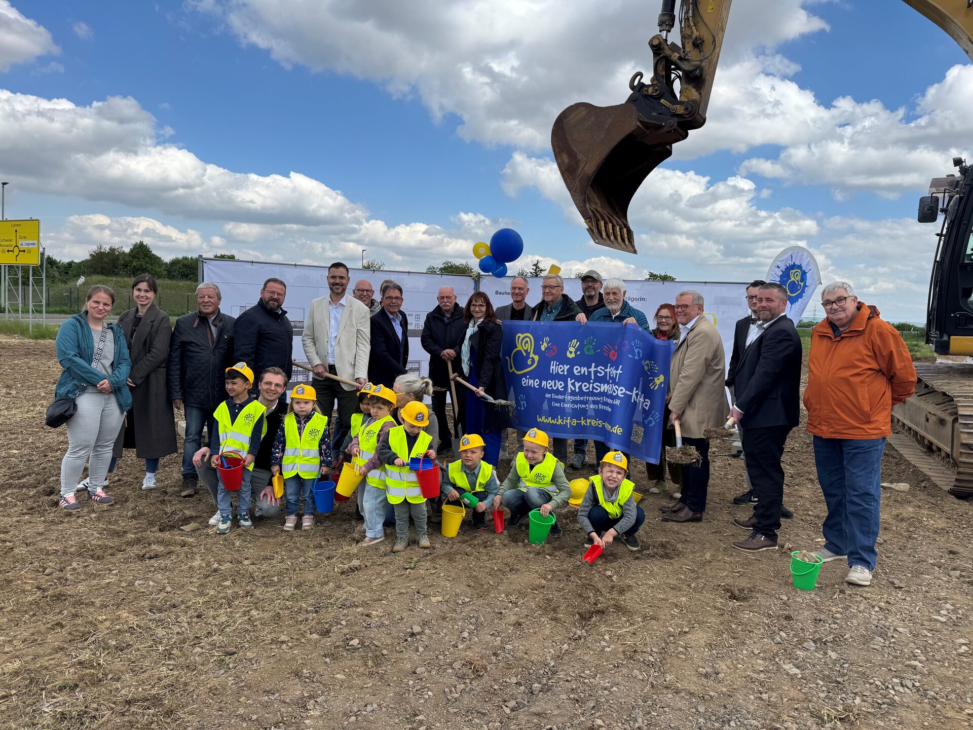 Kinder, Eltern, Vertreterinnen und Vertreter der Kita, der lokalen Politik, der Bauträger und der Trägerin, Kindertagesbetreuung Kreismäuse AöR (Anstalt des öffentlichen Rechts, eine Einrichtung des Kreises Düren) feierten den Spatenstich in der Töpfersiedlung.