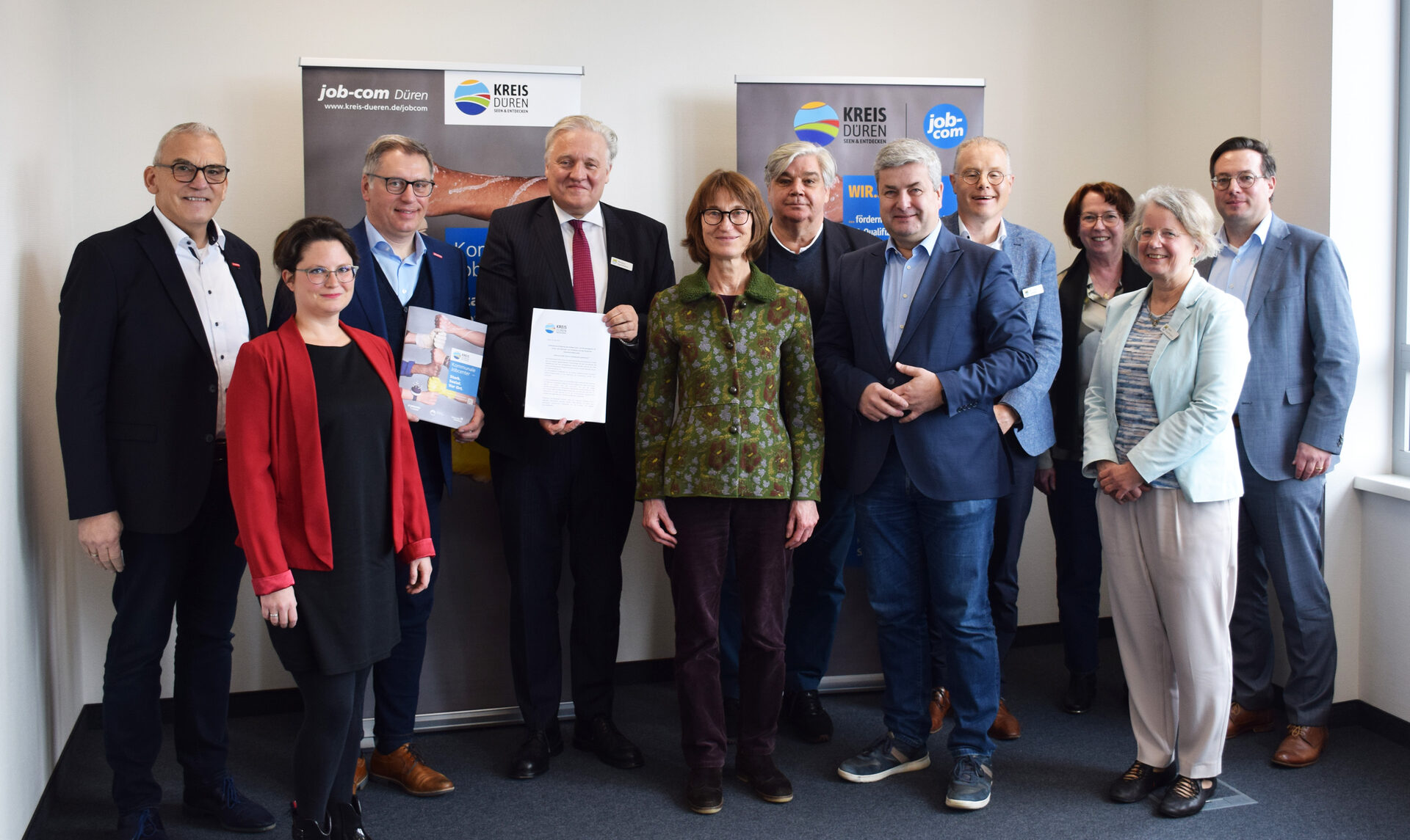 Die Vertreterinnen und Vertreter aus der Arbeitswelt und der Verwaltung unterzeichneten die gemeinsame Erklärung, um noch intensiver Menschen in Arbeit zu vermitteln: (v.l.) Johannes Willms (Vereinigte Kreishandwerkerschaft Düren-Euskirchen-Heinsberg), Ann-Katrin Steibert (Deutscher Gewerkschaftsbund Region NRW Süd-West), Wilhelm Grafen (Handwerkskammer Aachen), Landrat Wolfgang Spelthahn, Kerstin Faßbender (Industrie- und Handelskammer Aachen), Ulrich Käser (Agentur für Arbeit Aachen-Düren), Jörg Hamel (Handwerksverband Nordrhein-Westfalen Aachen-Düren-Köln e.V.), Karl-Josef Cranen (Amtsleitung job-com), Anette Winkler (Leiterin Abteilung Wirtschaft und Tourismus Kreis Düren), Kreis-Dezernentin Sybille Haußmann (vorne) und Stefan Cypers (V.I.V. Jülich, Euskirchen und Umgebung e.V.).
