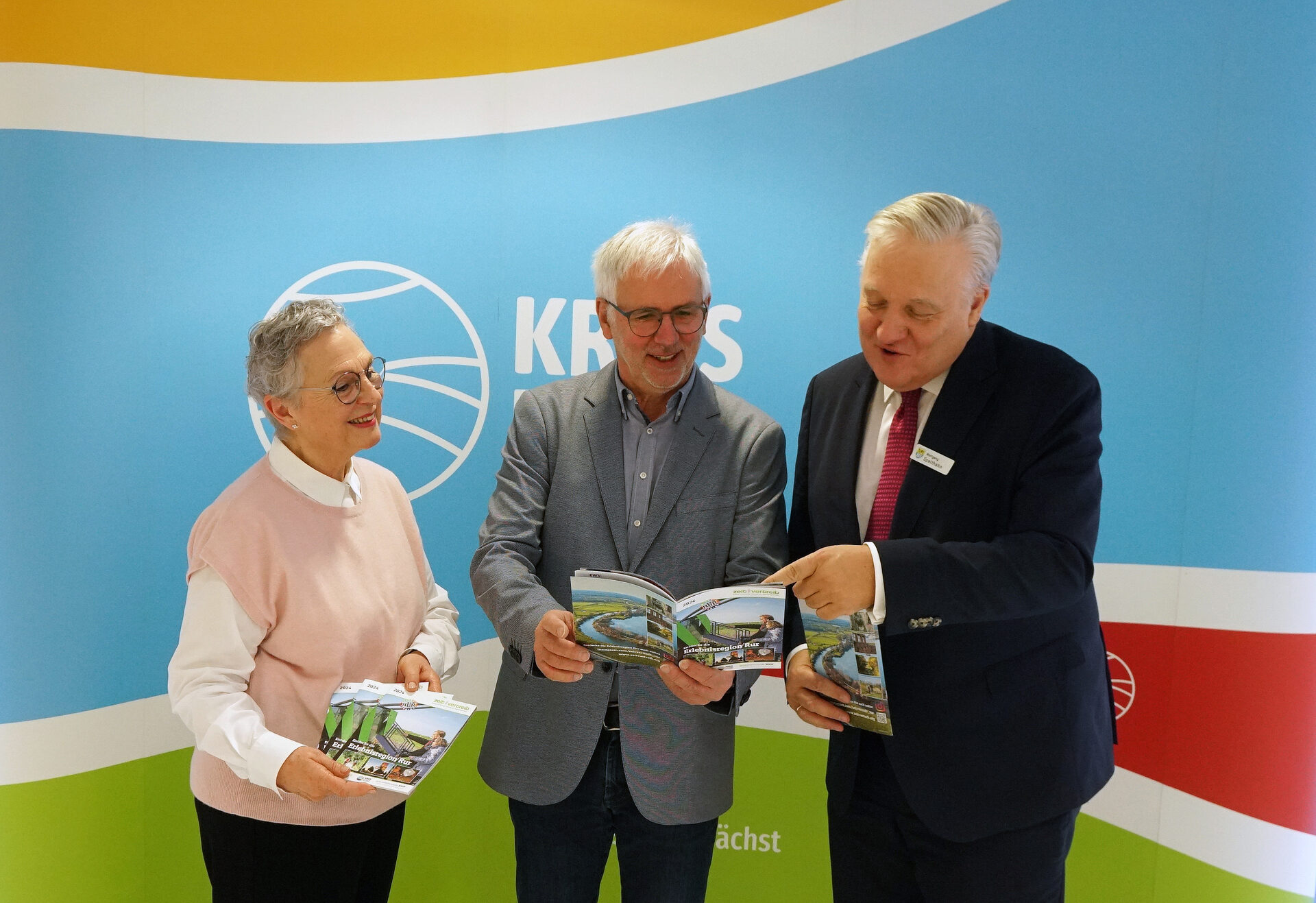 Marlene und Norbert Dreßen, die die Broschüre erstellt haben, präsentierten Landrat Wolfgang Spelthahn die neueste Auflage des Freizeitführers. In diesem Jahr rückt die rund 60-seitige Broschüre die Erlebnisregion Rur in den Mittelpunkt.